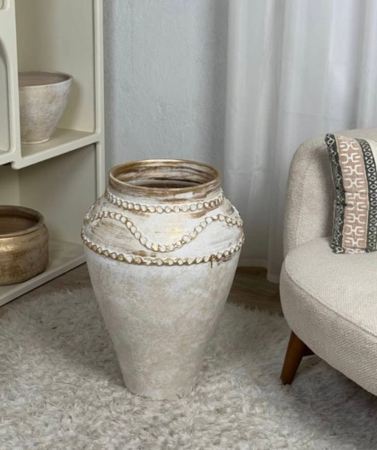 گلدان پتینه کاری دکوراتیو ۶۰سانت سفید طلایی مناسب گل طبیعی و مصنوعی