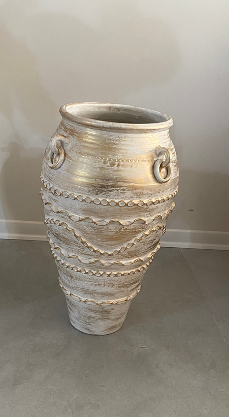 گلدان سفالی پتینهای مدل زنجیرهای سفید طلایی با طراحی خاص و جلوهای لوکس، گزینهای ایدهآل برای تغییر دکوراسیون منزل یا محل کار است.