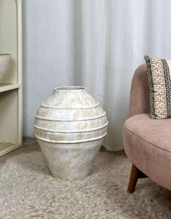 گلدان سفالی پتینهای مدل خطی سفید کرم طوسی با طراحی خاص و جلوهای لوکس، گزینهای ایدهآل برای تغییر دکوراسیون منزل یا محل کار است.