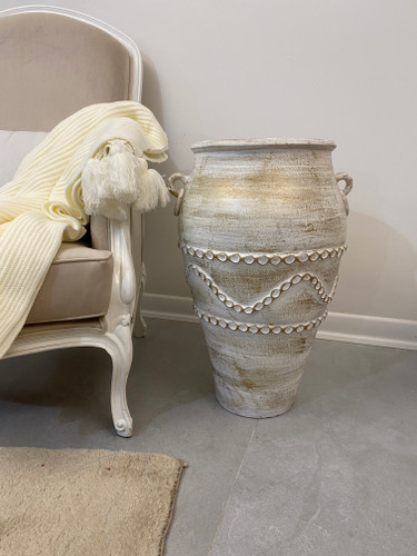 گلدان سفالی پتینه زنجیری سفید کرم مدل استوانهای ۶۰ سانتی دکوراتیو